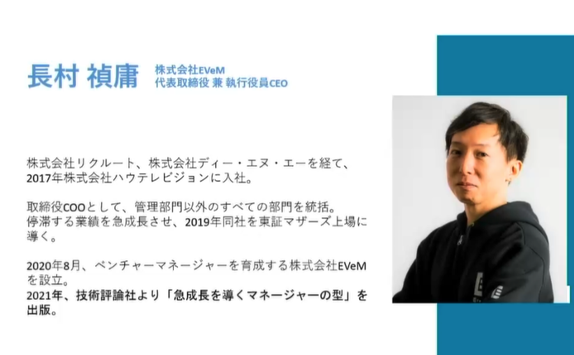 長村:私は、リクルートを出たあとにDeNAに勤めました。DeNAのときに初めてマネージャーになり、そのマネジメントの経験を活かしてハウテレビジョンという会社に入社しました。2020年にはEVeMという会社を創業し、ベンチャー企業の経営者やマネージャーにマネジメントを教える仕事をしています。