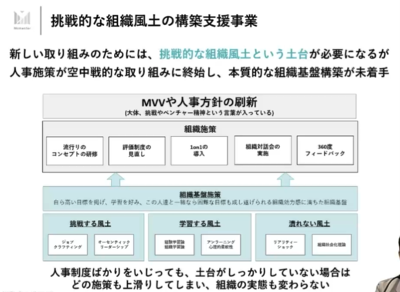 簡単に自社事業を紹介します。スライド資料に示されている図が重要で、上の部分が「ミッション・ビジョン・バリュー」であったり、1on1の導入といった組織施策に該当します。この上の構造への取り組みに終始しても、組織は変わりません。この下の部分のほうが重要で、本質的な組織基盤構築が大事ということです。