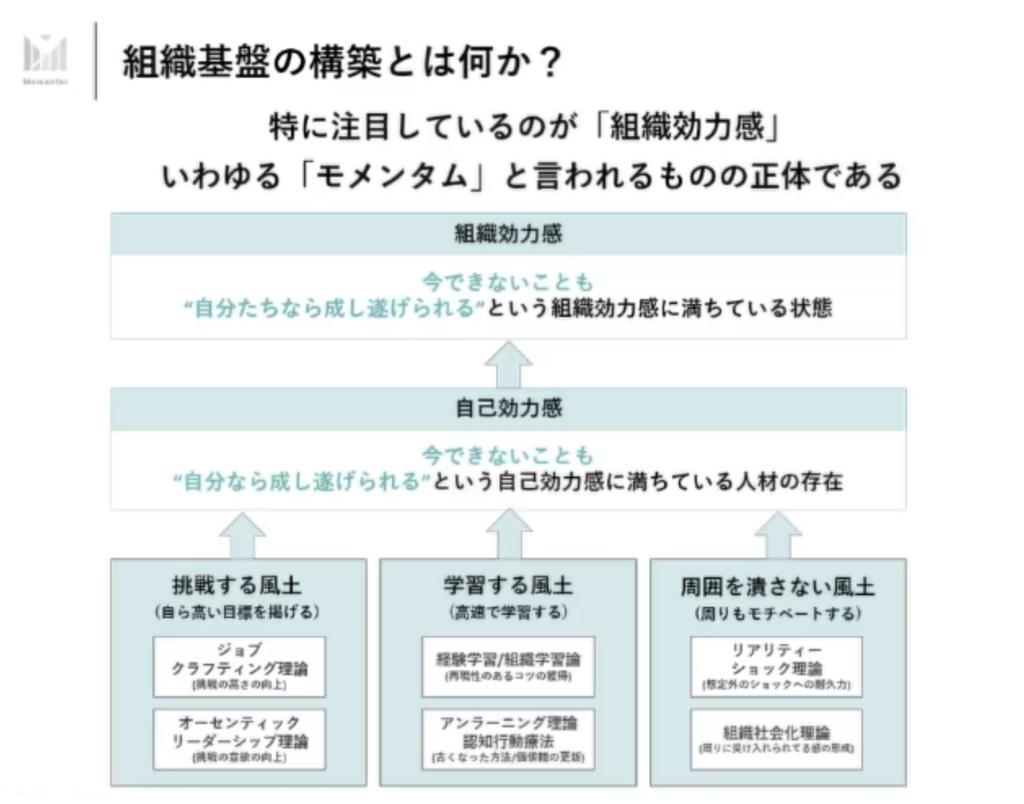 坂井:組織効力感は、世の中で「モメンタム」と言われているものです。そのモメンタムには2種類あると思います。1つ目は、「売り上げが伸びてます」「こういうPRをやっていきましょう」といった花火型のモメンタム。エナジードリンク的なもので、あまりおすすめしません。組織基盤からアプローチしたほうがいい。
