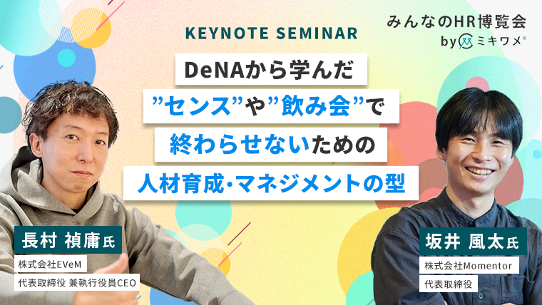 2023年3月20日、株式会社リーディングマークによって開催された「みんなのHR博覧会 by ミキワメ」において、株式会社EVeMの長村禎庸氏と株式会社Momentorの坂井風太氏が、「DeNAから学んだ『”センス”や”飲み会”で終わらせないための人材育成・マネジメントの型』」と題して講演しました。講演要旨は次のとおりです。