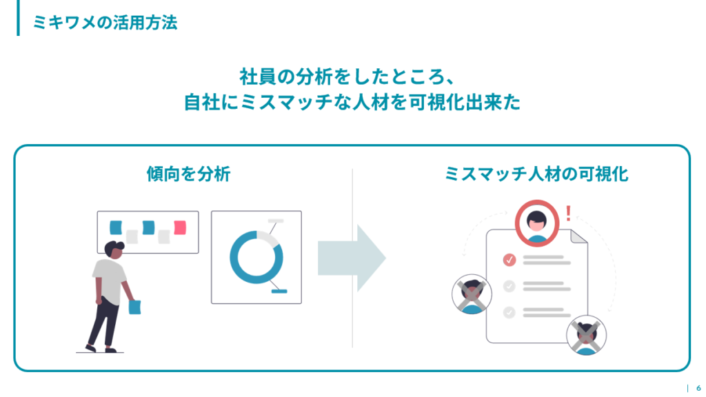 ミキワメ導入後、営業部門の800名に対して性格分析を実施したところ、性格の傾向とパフォーマンスの相関関係が見えてきました。その結果同社のカルチャーにマッチしづらい方を定義することができました。