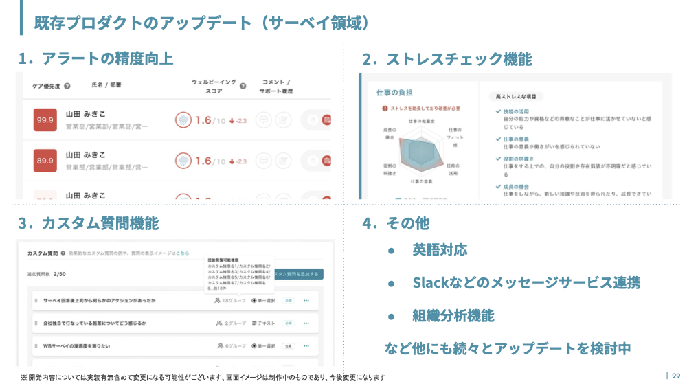 適性検査・ウェルビーイングサーベイのいずれの既存プロダクトにおいても、今後さらなるアップデートを実施していく旨をお伝えしました。