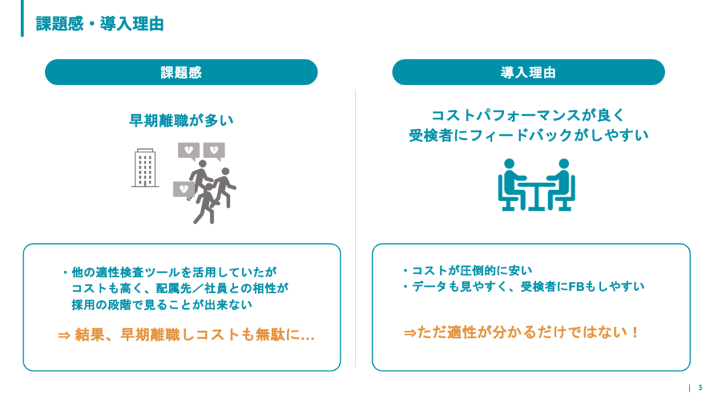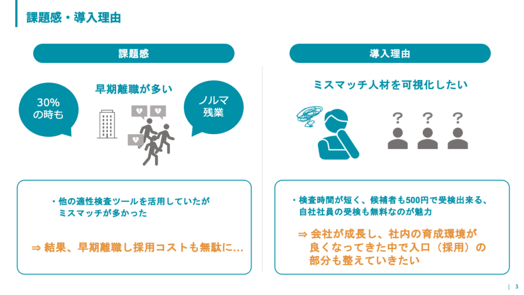 ミキワメを導入した背景としては、早期離職者の多さを課題に感じていた点が挙げられます。ミキワメ導入前は他の適性検査ツールを活用されていたそうですが、コストに見合った効果が得られませんでした。
