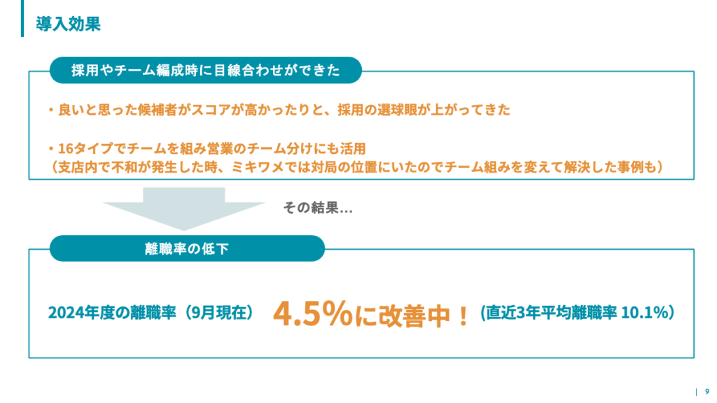 結果、離職率が10.1%(直近3年間の平均)から4.5%へと大幅に改善。今後もさらなるミキワメ運用を視野に入れており、インターンシップや退職者の傾向分析などへのミキワメ活用を計画されています。