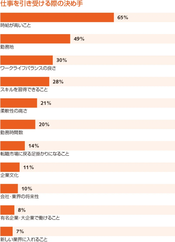 同時にホワイトカラー契約・派遣社員の職務実態調査でも、約11%のホワイトカラー契約・派遣社員が「仕事を引き受ける決め手」として「企業文化」を選んでいることがわかっています。