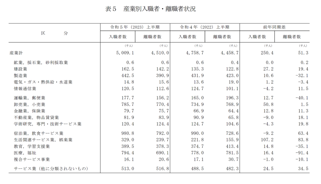 また、厚生労働省の「産業別の入職と離職の状況」でも以下のようなデータが算出されており、感情労働が求められる職種の退職者が多いことがわかりました。