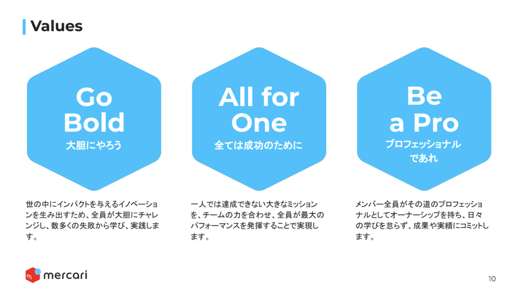 このCulture Docの中にまず書いてあるのが、ミッション、そしてバリューです。メルカリには3つのバリューがあります。 1つ目は「Go Bold(大胆にやろう)」。これが好きで入る人が本当に多いですね。2つ目が「All for One(全ては成功のために)」、チームワークですね。3つ目は「Be a Pro(プロフェッショナルであれ)」ということで、一人ひとりが自立した働き方や専門性を有し、向上し続けることにコミットしています。