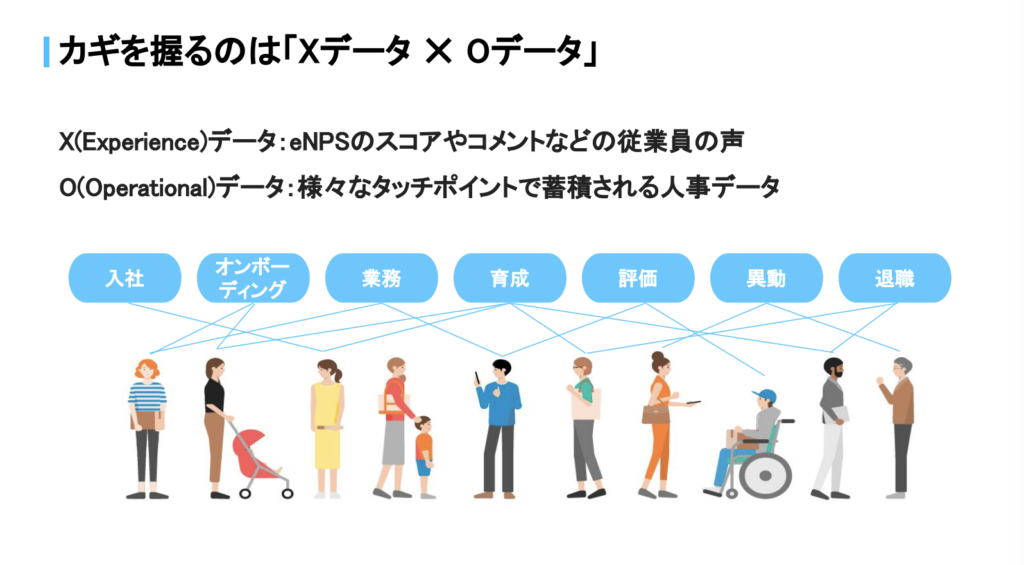 これはお客様を理解する消費者理解と同じようなアプローチです。そのときにXデータとOデータが大切だと思っています。 Xデータは、先ほどのサーベイなどで集まってくる従業員の声ですね。Oデータでは、色々なタッチポイントで人事データが形成されています。これは従業員のデータベースからもわかるところで、たとえばサーベイから「成長実感」というキーワードが出てきて、成長実感にギャップがある部分はどこだろう?と考えたときに、部門なのか、階層なのか、属性なのか、あるいは特定の社員体験をした人がそうしたギャップに繋がっているのか?という点を分析していきます。