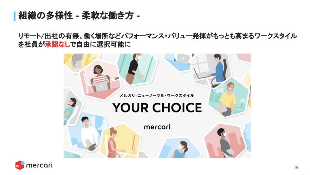 木下:もう1つエンゲージメントにおいて大事なポイントは、働きがいと合わせた働きやすさの実現です。働きやすさの実現には、先ほど言ったように一人ひとり働き方が違う、もしくはライフスタイルが違うという点をできるだけ尊重する必要があります。そうしたダイバーシティ・インクルージョンの考え方で、メルカリは去年9月に「YOUR CHOICE」というポリシーを発表しています。これは、働く場所を社員個人が選べる仕組みです。