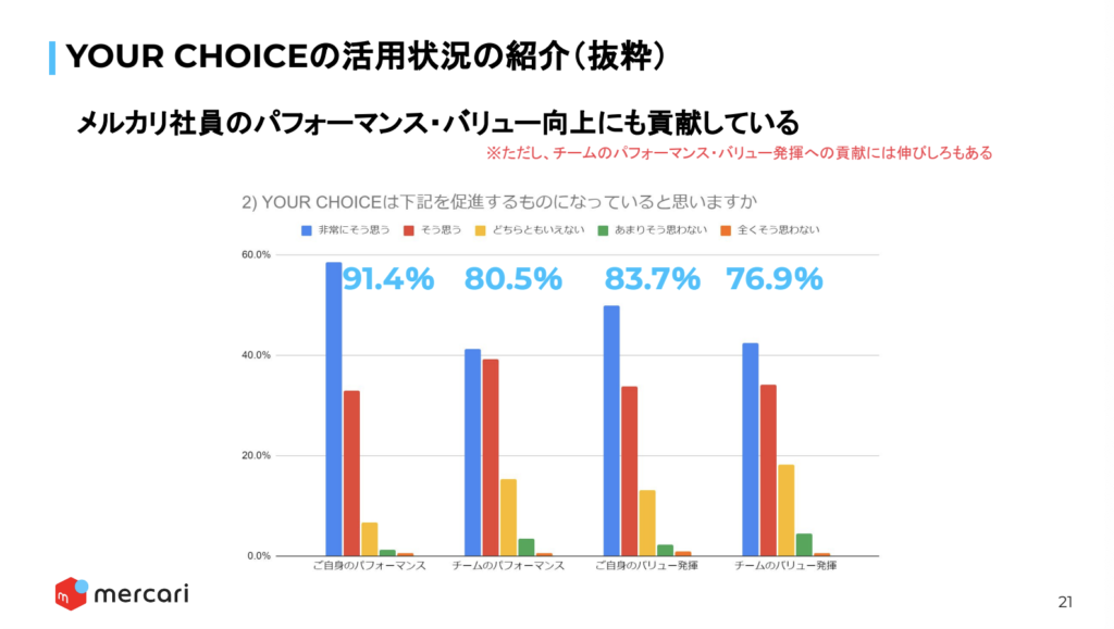 時間を選んで働けていることで、一人ひとりの多様なライフスタイル・ニーズを満たせていると思います。 会社としては、パフォーマンスとバリューがしっかり高いレベルで、それも個人だけじゃなく、チームで高いレベルを実現している状態が担保できていればいいので、その実現と個人のライフスタイル・ニーズの実現の両方が高いレベルで満たされたらいいと思っています。 以上です。簡単にですが、エンゲージメントの高い組織を作るという点に関して、メルカリが取り組んでいる内容をお話ししました。