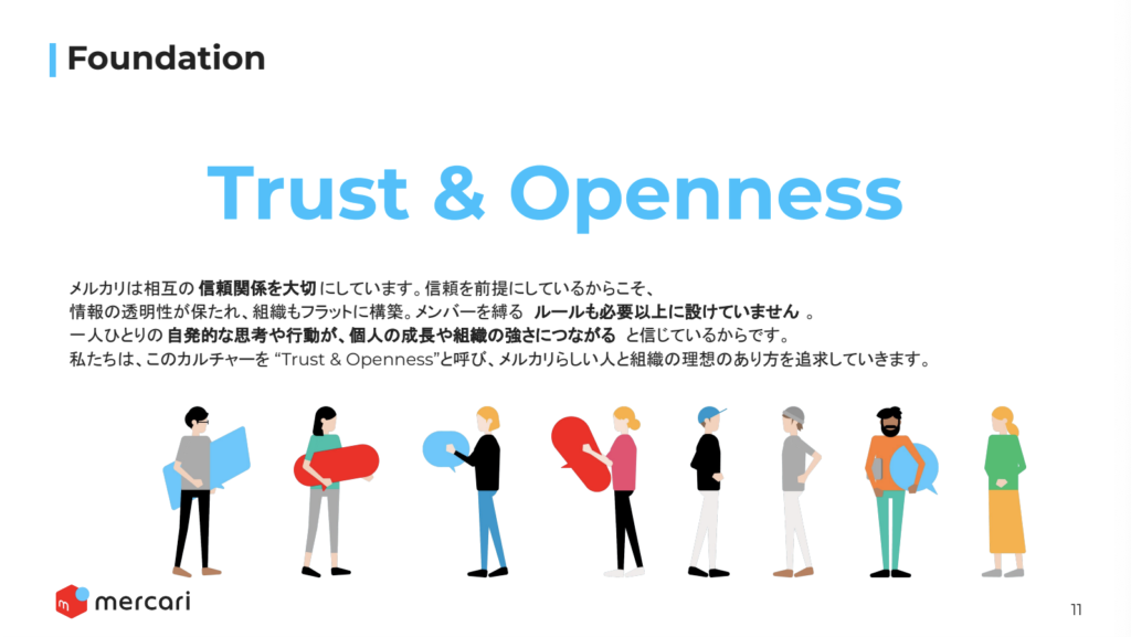 1つ目が「Trust&Openness」です。以前は「性善説」という言い方をしていました。ただ、性善説だと外国籍の方がなかなかピンと来ないので、「Trust&Openness」に変えています。相互に信頼関係を持つことでルールをできるだけ作らない、という考え方であったり、社内の情報共有度をできるだけオープンにしたりしています。「マネージャーは情報格差でマネジメントしない」ということもメルカリでは徹底しています。すごく情報共有度が高く、逆に情報の洪水に溺れる現象が起きているので(笑)、そこのナビゲーションも併せて重要かなと思っています。