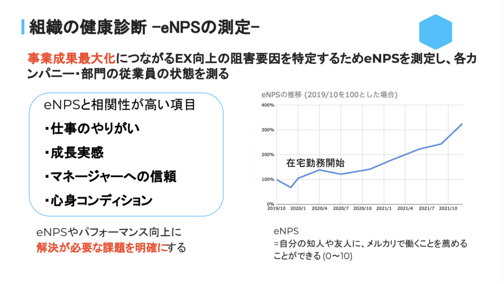 木下:メルカリでは3カ月ごとにエンゲージメントサーベイを実施し、定点観測しています。そこで「eNPS」というものを使っています。これは、メルカリという会社を他の人に勧めたいと思うか?という指標です。プロダクトのNPSがありますが、それの会社版がeNPSといえます。 コロナに入る前からのトレンドを、今グラフで表示しています。右肩上がりで非常にエンゲージメントが高い状態で、しかも向上し続けていることが確認できています。