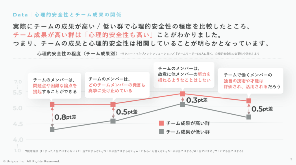 たとえば1つでも「差がほとんどありません」「むしろ逆転しています」という話だったら別ですけれど、心理的安全性が高いチームはちゃんと成果が出せることが様々な項目でも飛び抜けていることがわかってきています。