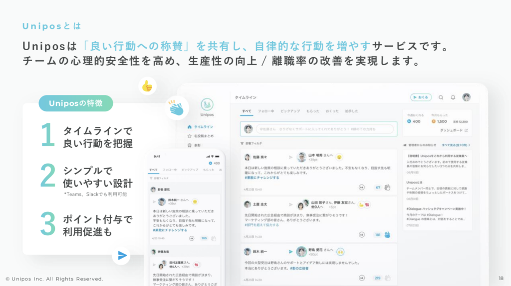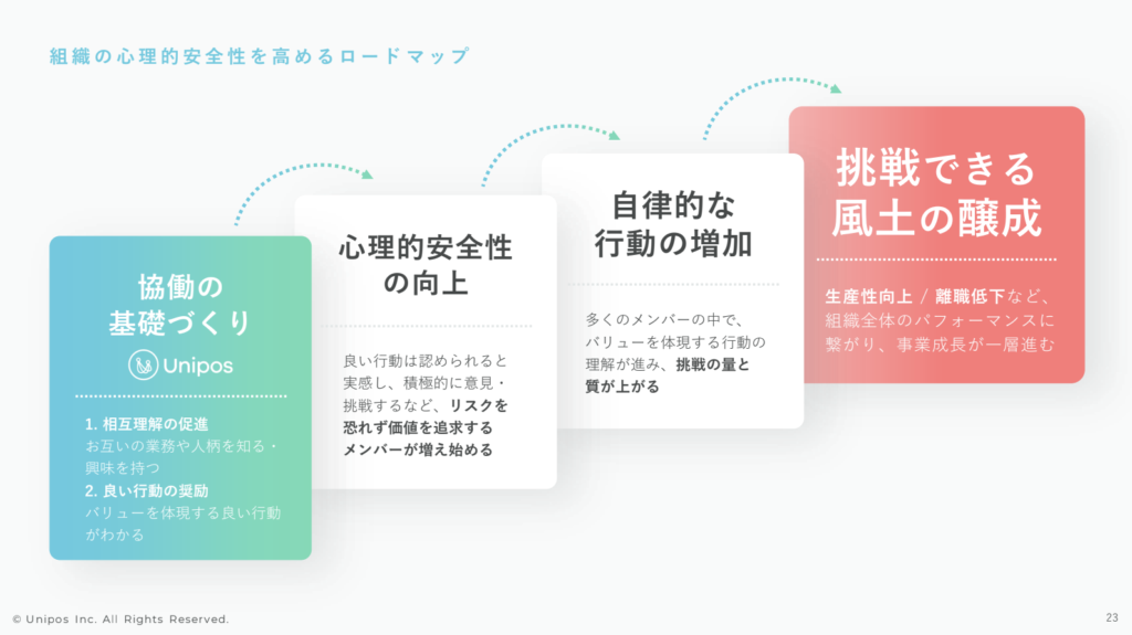 このUniposというサービスは、そもそも従業員の心理的安全性を高める効果を狙って構築されたプロダクトです。Uniposの活用有無に限らず、心理的安全性という概念が今大きく組織論の中で注目されています。