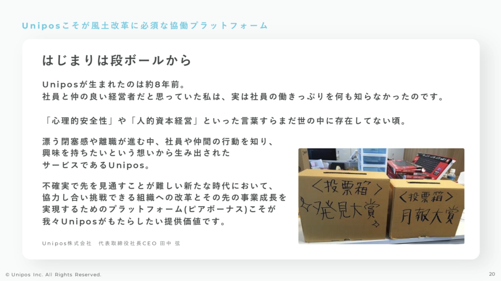 田中:はい、よろしくお願いします。Uniposの代表をしている田中と申します。今日はあまりUniposの宣伝にならないように、心理的安全性の高め方について話していきたいと思います。そのなかで、少しだけUniposの話もできれば幸いです。