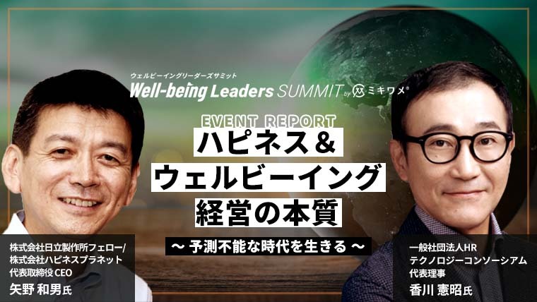 2022年9月28日・29日に株式会社リーディングマークによって開催された「ウェルビーイングリーダーズサミット」において、株式会社日立製作所フェロー / 株式会社ハピネスプラネット代表取締役CEOの矢野和男氏と、一般社団法人HRテクノロジーコンソーシアム代表理事の香川憲昭氏が、「ハピネス&ウェルビーイング経営の本質 ~予測不能な時代を生きる〜」と題して講演しました。講演要旨は次のとおりです。