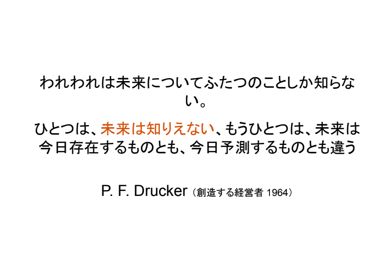 50年前にドラッカーが「未来はそもそも予測できない」と断言しています。現在の世の中は、昨日の前提を超えることが今日、明日と常に起きています。これは予測不能です。この前提自身が日々変わるなかでは、黙って昨日のとおり今日の業務をやっていても、変化を感じとれません。そのため、見直しを積極的に実施していく必要があります。