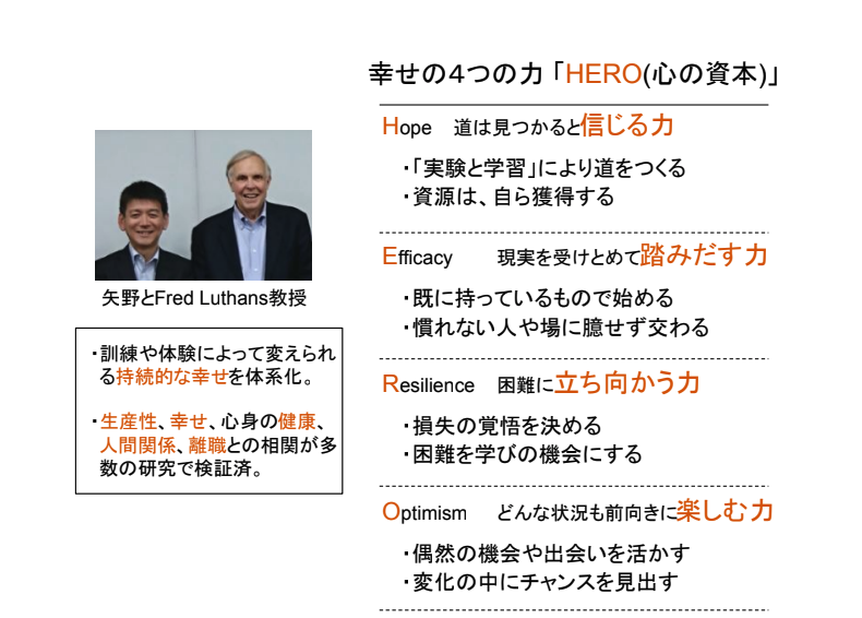 我々が常に高めていける幸せというのは、実は4つの要因で成り立っています。それを明らかにしたのがFred Luthans教授です。