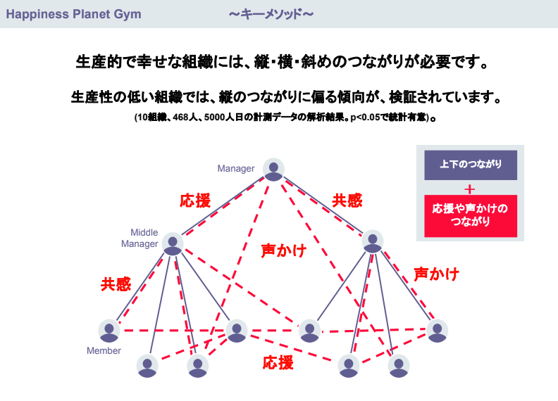 システムデータを確認すれば、過去の履歴でどこがV字型(上司や部下の縦の関係)になっているか、どこが三角形(同僚との横や斜めのつながりを含めた関係)になっているか全部わかります。このV字状を無くし、三角形で組織中が埋まるように自動でアサインする。要するに、応援を通じて人間同士の繋がりを組織の中に作る試み。こうした仕組みとなっています。