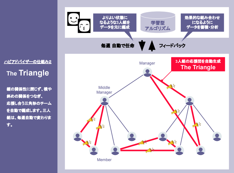 さらに、デジタルならではのサービスが「The Triangle」です。月曜日になるとシステムが3人組の応援団を自動生成します。私がそのひとりだとすると、私が前向きなことを書くと、ほかの2人が応援してくれる。一週間、3人組で互いに応援しあい、翌週になるとまた新たな3人組が組まれます。