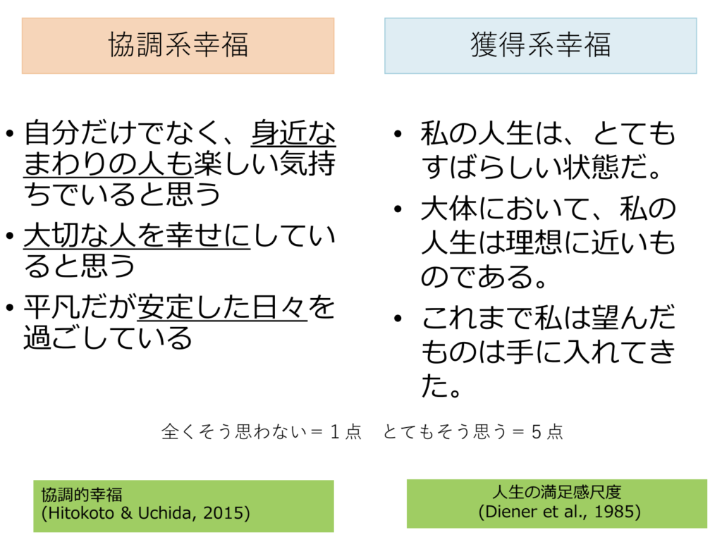 ところが協調的幸福観からみると、従来の尺度はフィットしません。実際に、従来の人生満足感尺度ですと、日本や韓国がいつも低い数値になっています。ひょっとすると、獲得的幸福観は日本にマッチしていないのではないでしょうか。