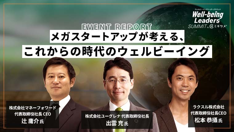 飯田:ありがとうございます。お三方から大変貴重なお話をいただきました。本日はラクスルの松本社長、ユーグレナの出雲社長、そしてマネーフォワードの辻社長にお越しいただき、「メガスタートアップが考える、これからの時代のウェルビーイング」というテーマでディスカッションしていただきました。どうもありがとうございました。