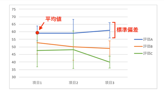 今回は簡易的に、「平均と標準偏差のプロット(折れ線グラフ)」 を使用しています。