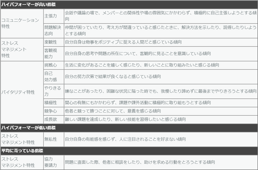 「挑戦心」、「自己効力感」、「やりきる力」、「積極性」、「競争心」、「成長欲」といった項目において、ハイパフォーマー群高いことが分かりました。