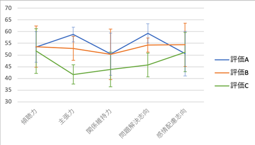 この結果を見ると、「主張力」と「問題解決志向」が評価Aと評価Cで差が大きいことが分かります。