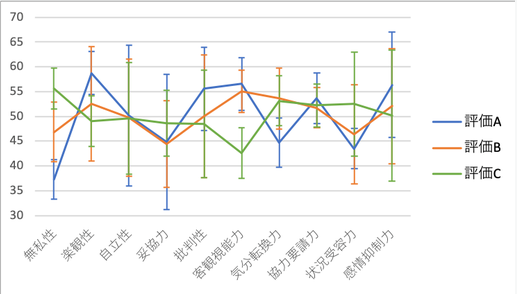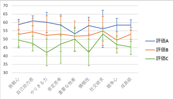 結果を見てみると、「楽観性」、「客観視能力」が高く、評価C群と差があることが分かります。また、「無私性」はA群が低いことが読み取れます。