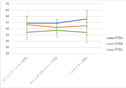 まず、「ミキワメ」の大枠である”コミュニケーション特性”、”ストレスマネジメント特性”、”バイタリティ特性”がそれぞれ、評価別に差があるかを見ていきましょう。