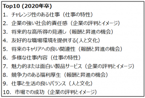 このランキングは2019年2,3月調査時に、上位校学生が企業の選定軸として選んだ項目の上位10項目です。
