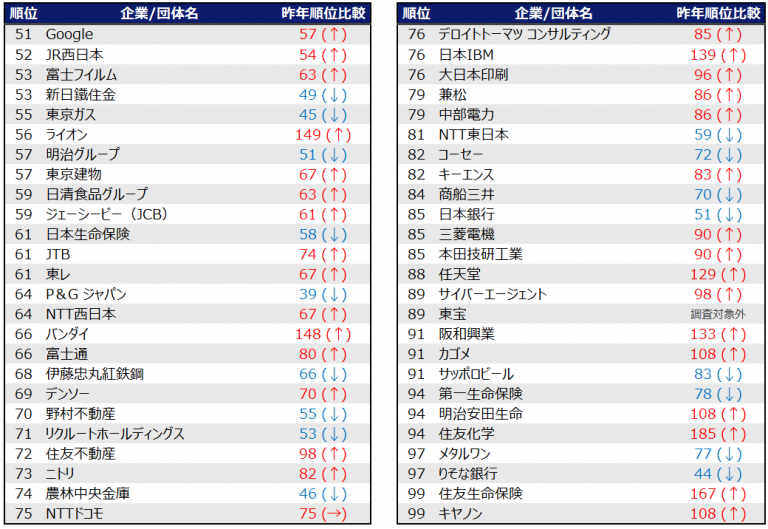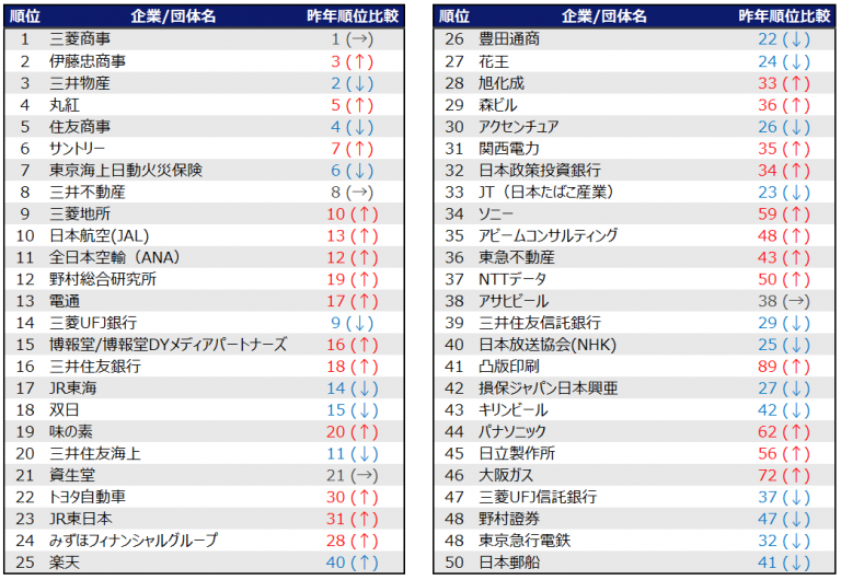 - 総合商社:三菱商事、三井物産、伊藤忠商事は最初から高順位にランクインしている一方で、それ以外の七大総合商社は、年間を通じじわじわとランクを上昇させており、春には上位30社にはランクインする結果となりました。