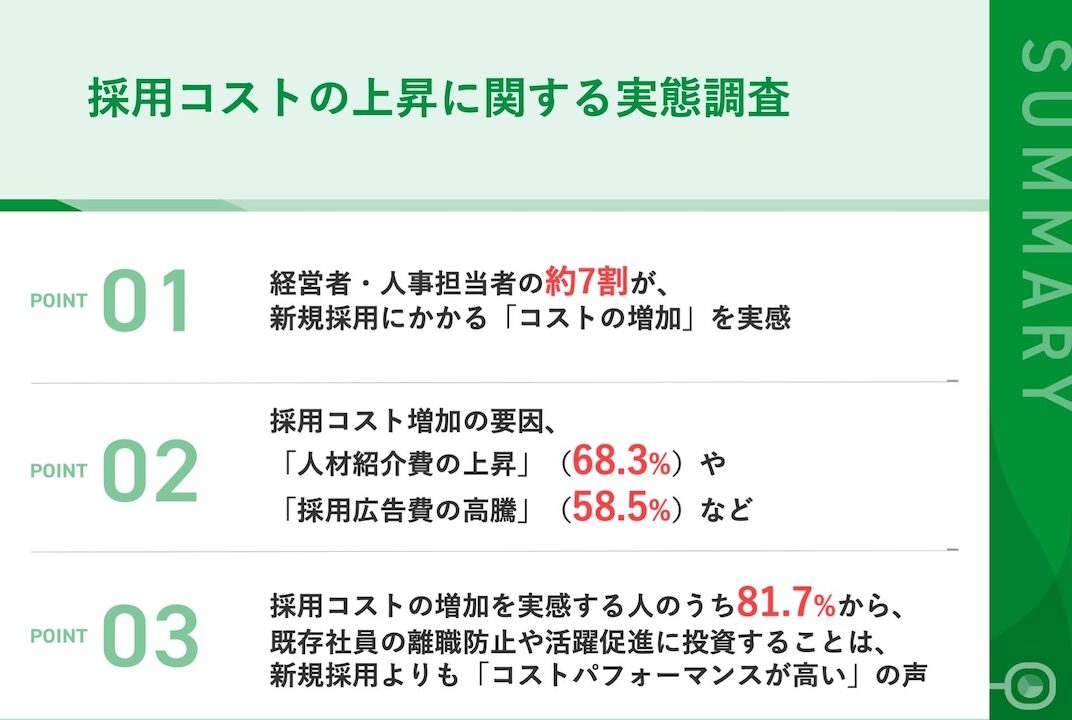 - 採用コスト増加の要因、「人材紹介費の上昇」「採用広告費の高騰」など