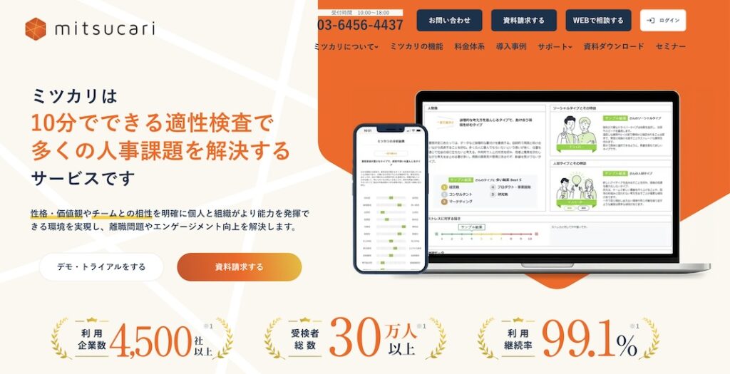 『ミツカリ』は、4500社を超える導入実績と、99.1%の利用継続率を誇る信頼性の高い適性検査ツールです。