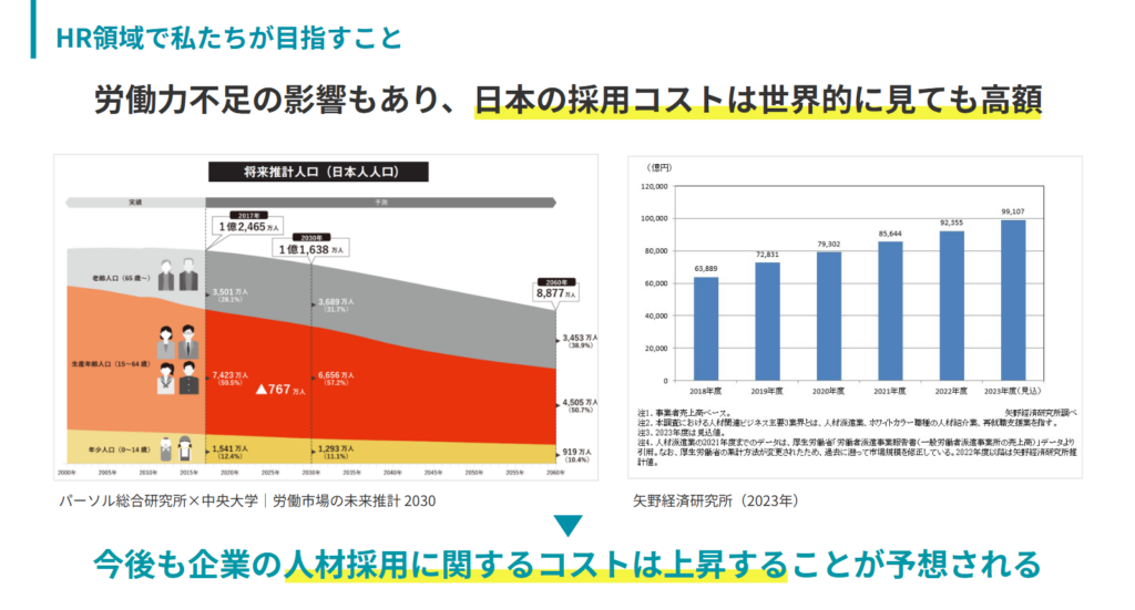また、日本の人材領域の市場は年間約10兆円あると言われており、企業が採用にかけているコストも年々増した結果、今では世界的に見ても高額になっています。