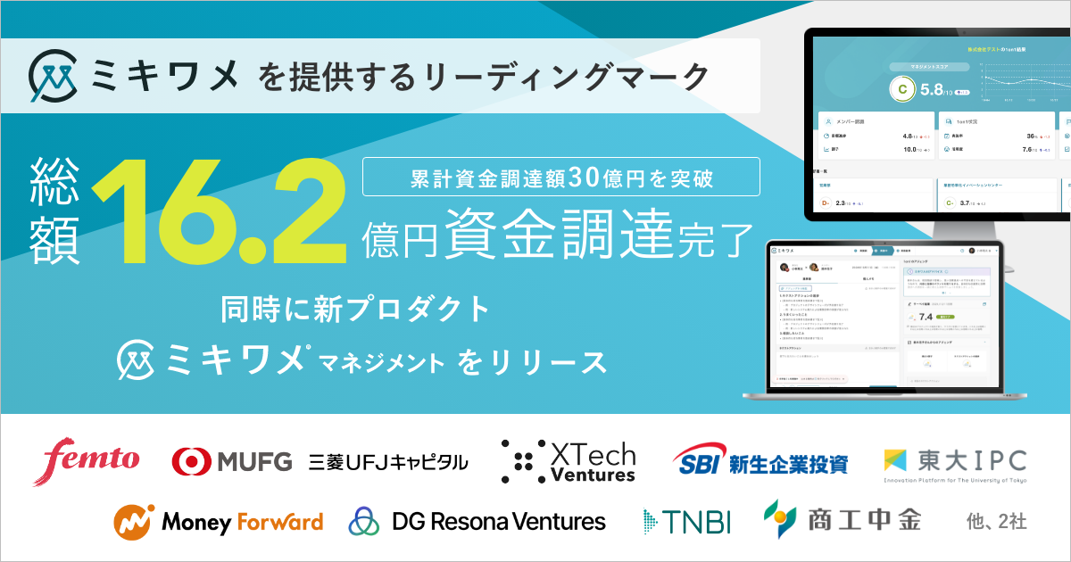 この度株式会社リーディングマークは新サービス「ミキワメ マネジメント」をリリースすると同時に、資金調達16.2億円(累計資金調達額30億円を突破)を実現しました。