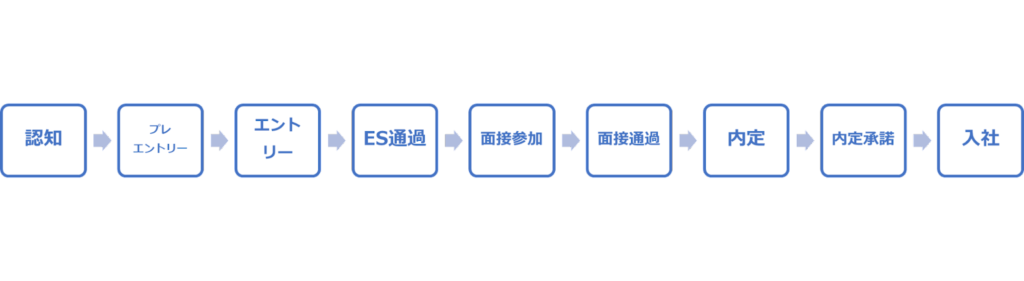 学生は、まず企業の存在や求人情報を「認知」します。さらに興味を持ったら、「プレエントリー」や「エントリー」に続きます。そして「ES通過」、「面接参加」と「面接通過」などの段階を経て、最終的に「内定」を獲得します。その後、学生は「内定承諾」をして「入社」することになります。