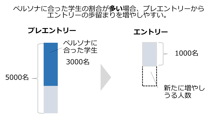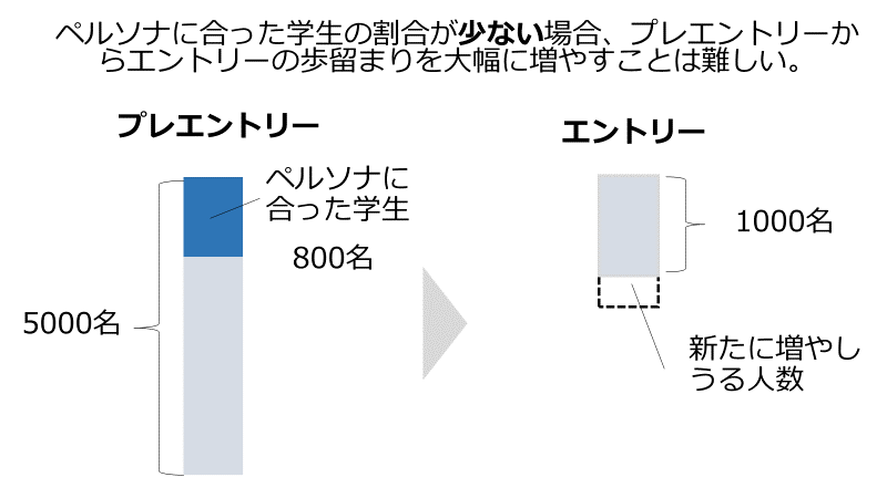 例えば、ある企業において、5000名プレエントリーを獲得できているものの1000名しかエントリーしてくれていないという状態だったとしましょう。この歩留まりを改善し、より多くのエントリー獲得を試みるとします。その5000名のうち、自社を知れば志望してくれるペルソナの学生が1200名程度しかいないとすれば、1000名から大きくエントリーの数を増やすことはそもそも難しいのです。